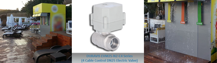 When "PUSH" button is pressed, the timer which is set to 15 seconds sends the electrical signal to the DURAVIS EVM series of mini motorized valves. During this time, the valves begin to open and remain open for 15 seconds and water-flow begins through the pipeline, DN25 (1 "). 15 seconds is over, timer changes the switching and the valve-closing begins and the flow of water shuts off. Thus showering pleasure ends. To live that enjoyment again, it is need to push the "PUSH" button which triggers DURAVIS mini motorized valves.